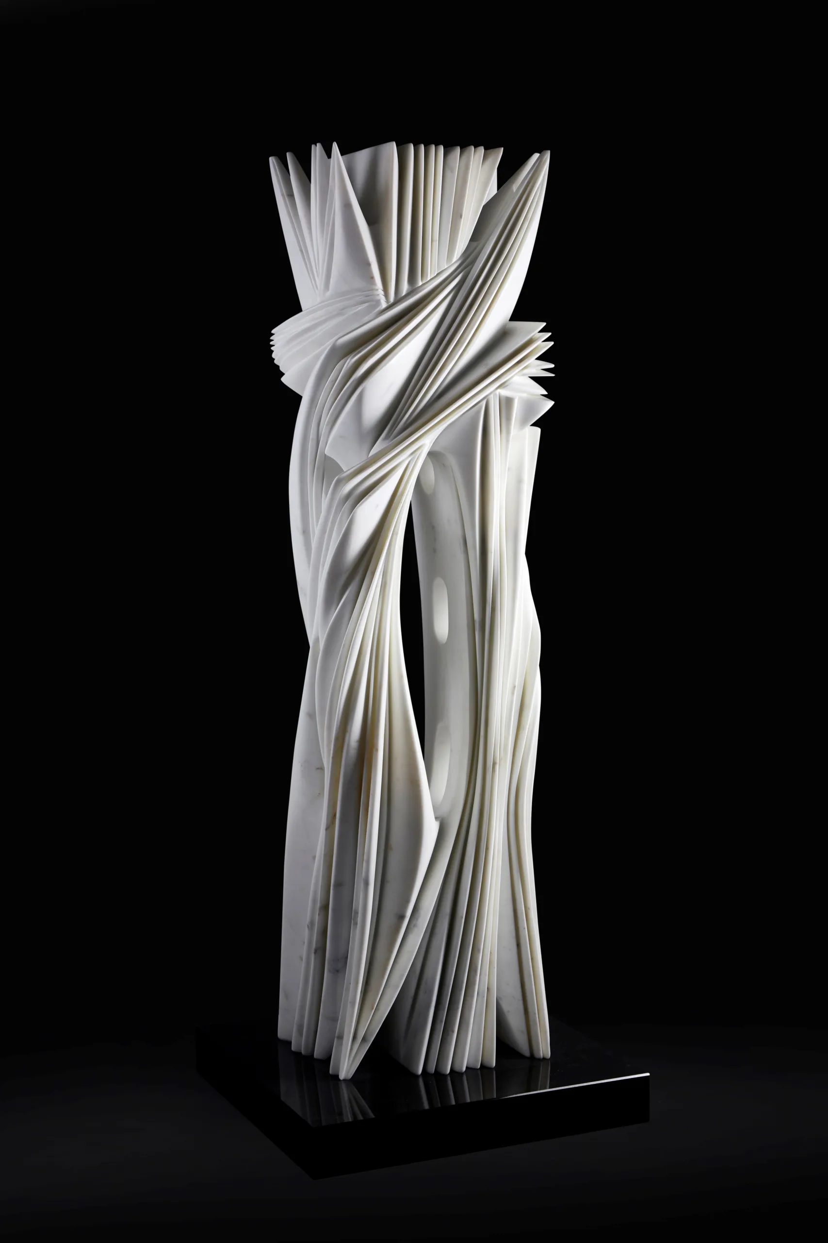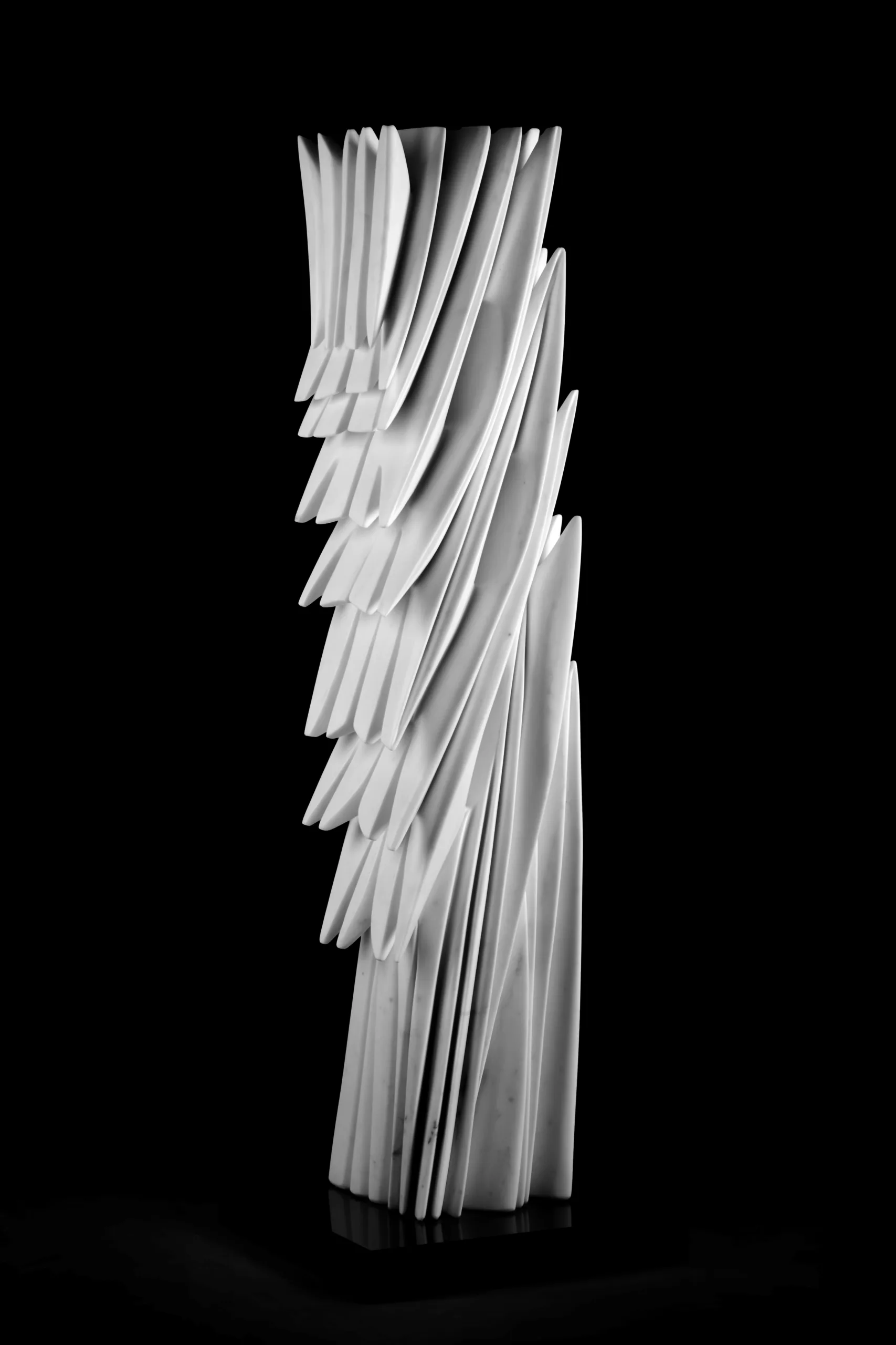 L’atto dello scolpire si configura come un gesto radicale e necessario, fondato sulla centralità della mano e sul confronto diretto con la difficoltà tecnica e materiale. Ogni opera nasce come sfida e come ricerca di equilibrio tra permanenza e movimento, memoria e contemporaneità. Le sculture si distinguono per forme metamorfiche, talvolta quasi aerodinamiche, che evocano tracce astratte di alberi, colonne, fiamme, corpi, panneggi e architetture, conducendo lo sguardo verso l’alto e suggerendo un’esperienza contemplativa e rigenerante.